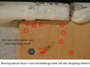 Bed bugs leave behind tell tale signs near where they “nest” or “hide”. When deposited on solid surfaces such as bed frames or slats, they are raised and bumpy to the touch. If it is smooth to the touch then it is not a fecal trace and is more likely to be a stain of natural discoloration.